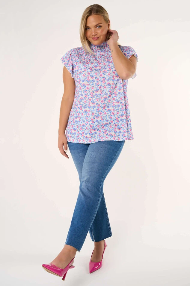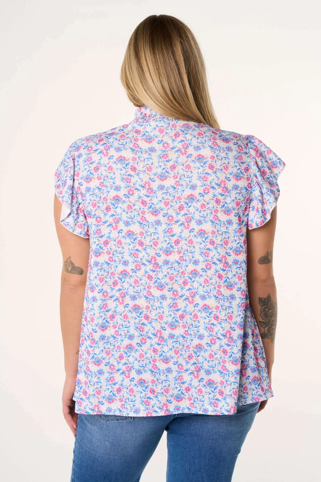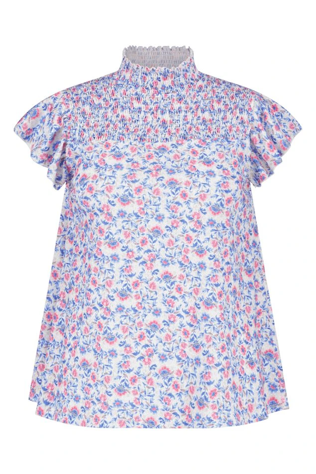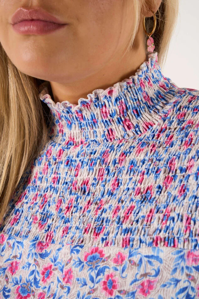 Ce magnifique haut à manches courtes et à volants est un must-have. Il est élégant grâce à son col haut et à ses détails smockés. Le haut a une coupe flatteuse qui s’évase légèrement, ce qui le rend à la fois confortable et élégant. Confectionné avec un tissu extensible, il offre une combinaison parfaite de liberté de mouvement et de maintien de la forme. Une pièce polyvalente pour toutes les occasions !