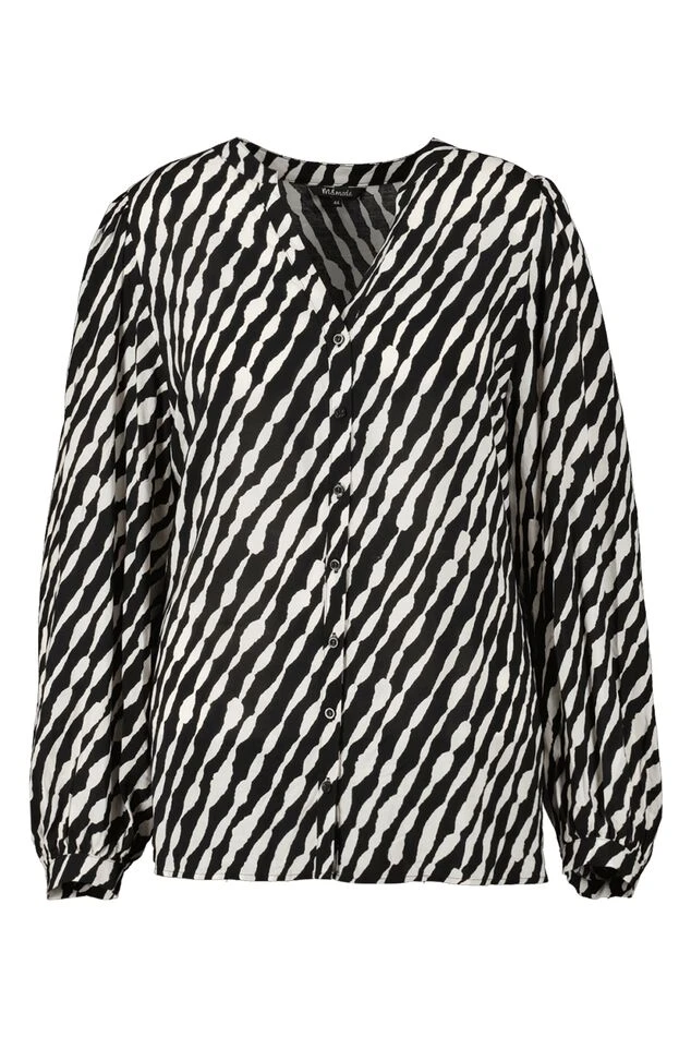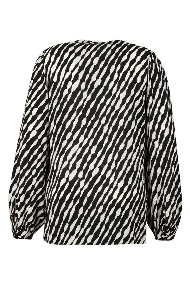 Un chemisier élégant avec un imprimé noir et blanc. Le chemisier présente des manches volumineuses et une encolure en V. Combinez ce chemisier, par exemple, avec un joli pantalon ou un jean.
