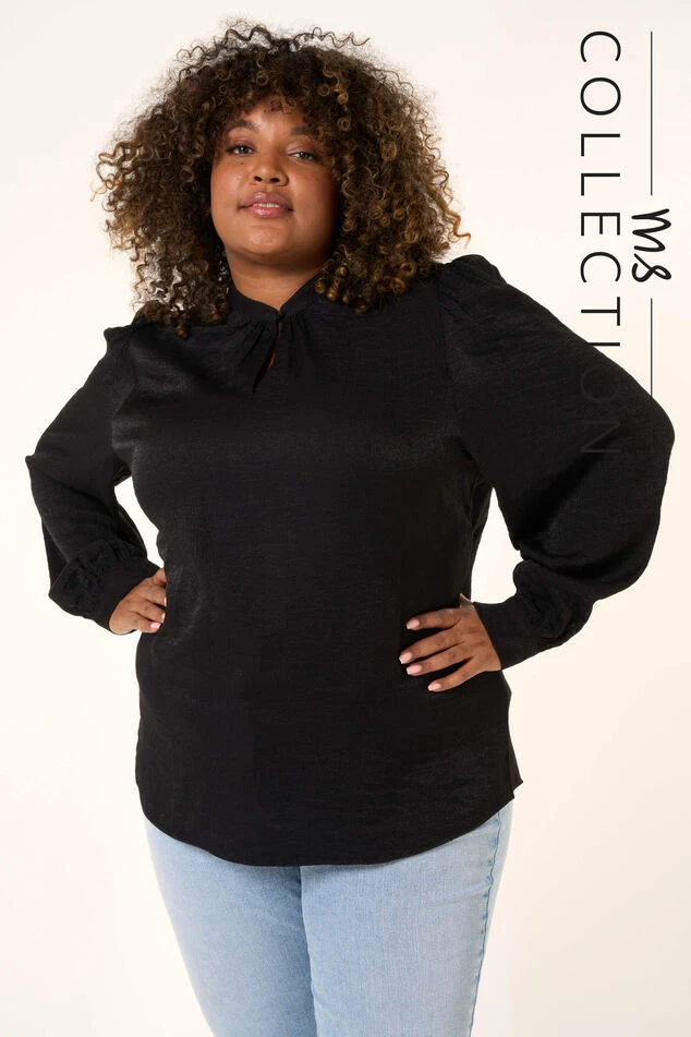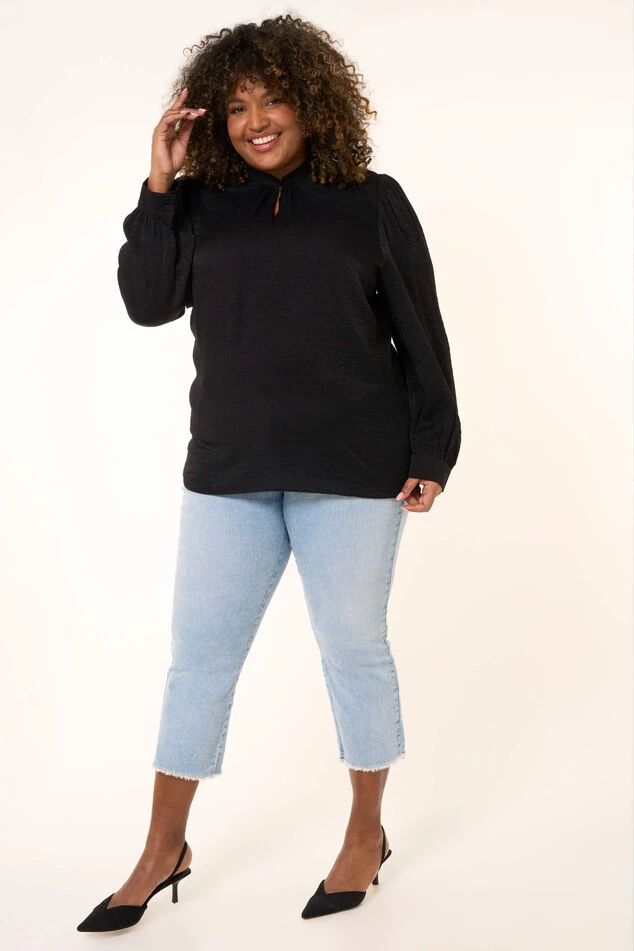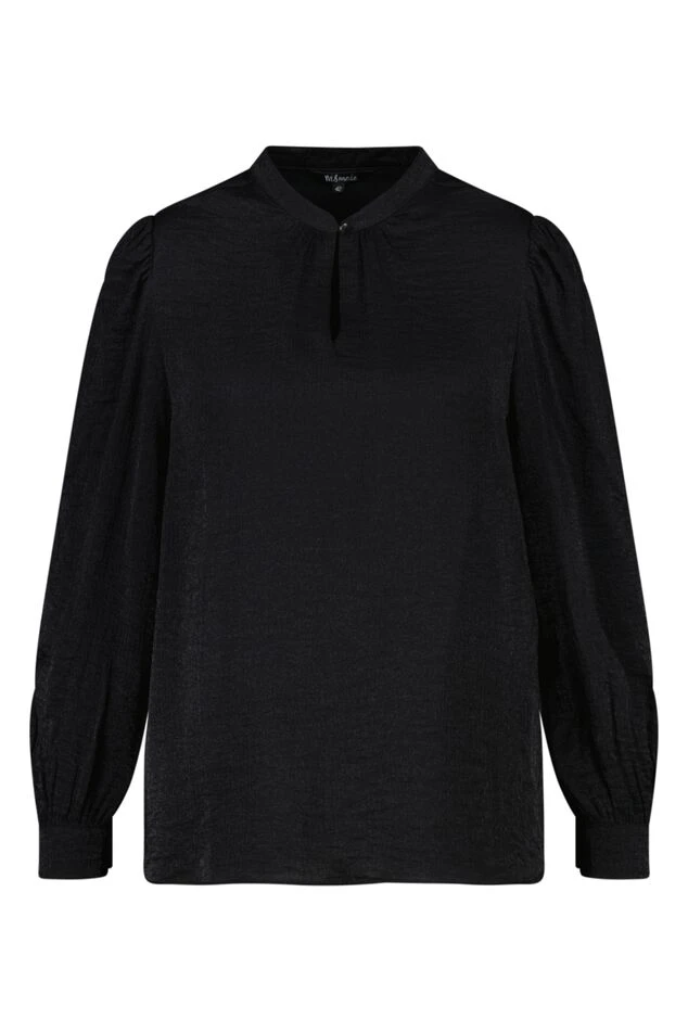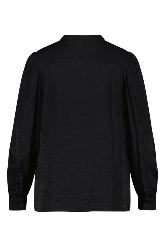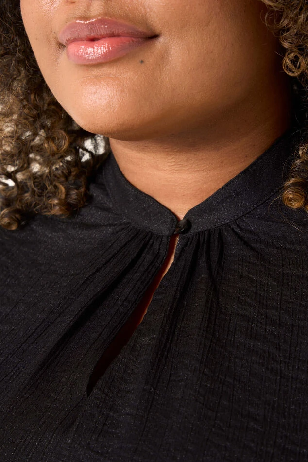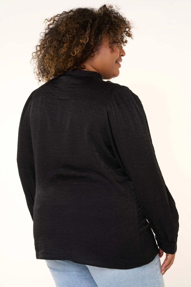 Ce chemisier noir brillant est composée de viscose et comporte une fermeture boutonnée au niveau du col. Non seulement il est confortable, mais il se drape également à merveille.