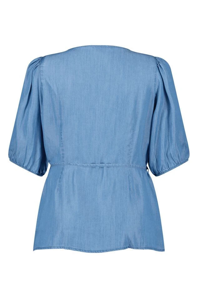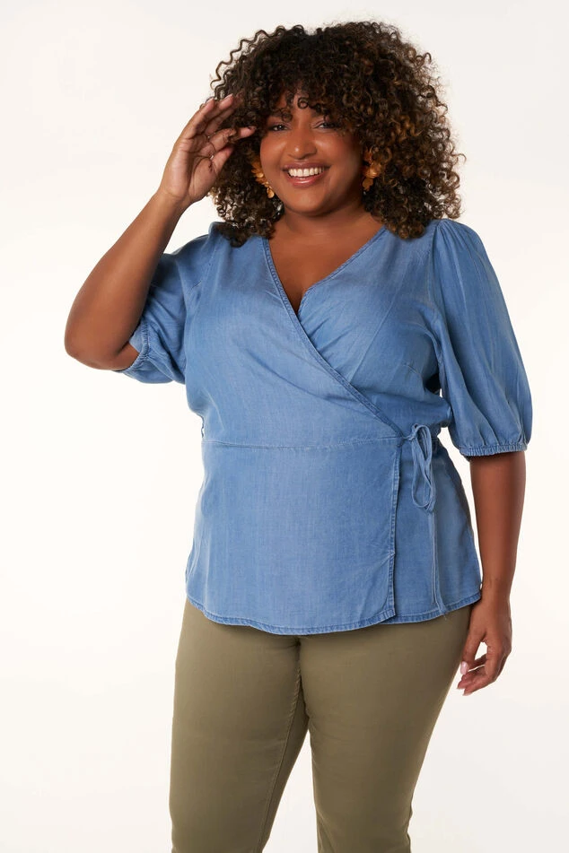 Ce chemisier portefeuille en tencel à l’aspect denim est magnifique ! Le tissu a un toucher doux et la robustesse d’un look denim. Il comporte des manches courtes et volumineuses et un cordon pour que vous puissiez le nouer à votre guise. Complétez votre look en associant le chemisier à nos superbes jeans !