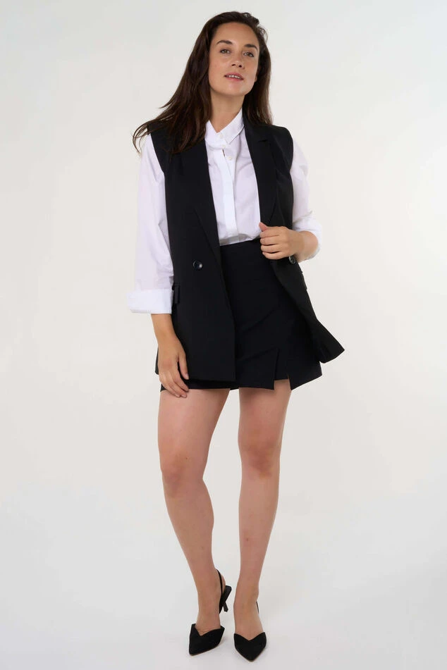 Ce gilet boutonné noir est un article polyvalent qui peut facilement être associé à un pantalon noir. Il ajoute une touche de style à n’importe quelle tenue. Polyvalent et chic, ce gilet peut être porté pour un look de bureau formel ou avec un chemisier et un jean pour un style plus décontracté. Ajoutez ce magnifique gilet noir à votre garde-robe pour des combinaisons chic et polyvalentes à l’infini.
