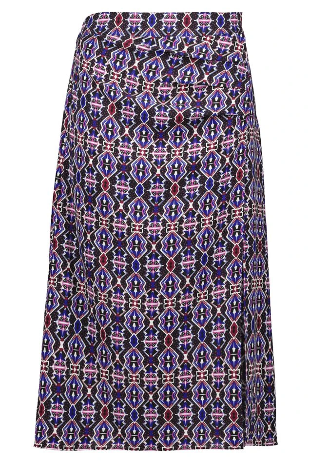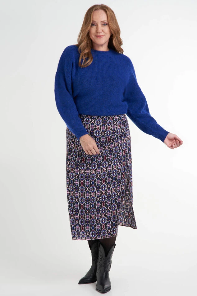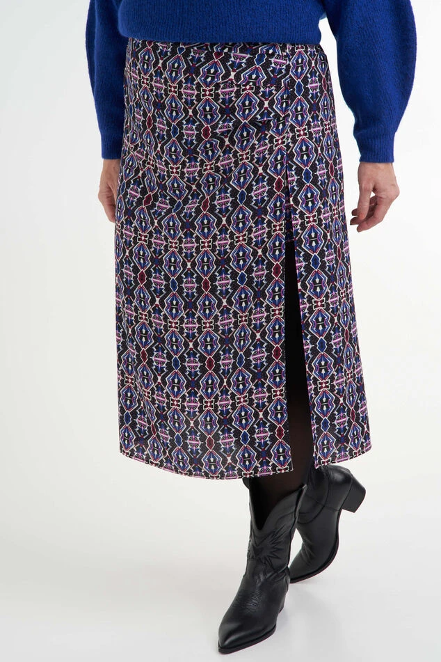 Cette jupe midi est dotée d’un magnifique imprimé bohème coloré, et fera vraiment ressortir votre tenue. Elle est dotée d’une fente et d’une sous-jupe.