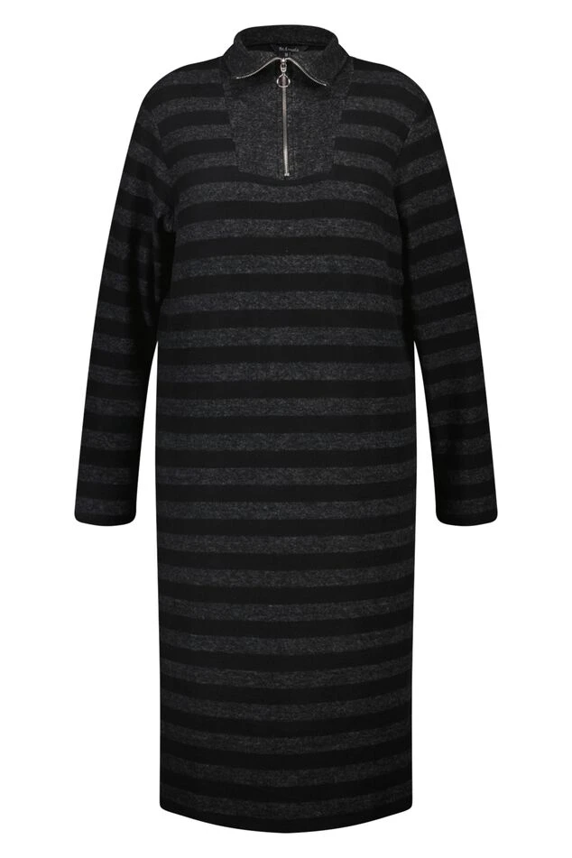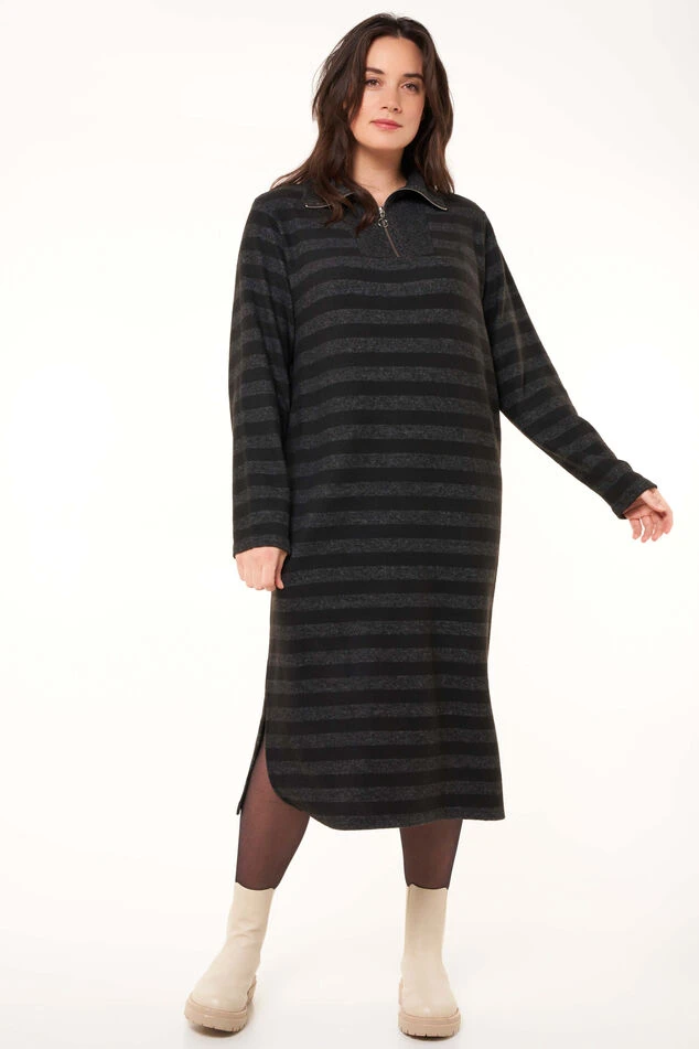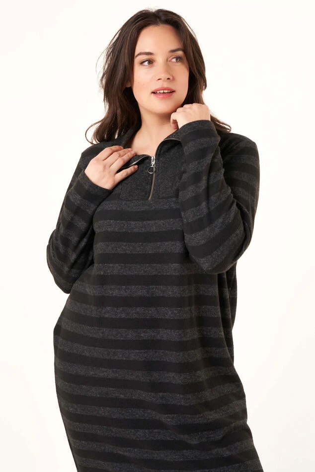 Dans cette robe souple à fermeture éclair, vous êtes sûre d’être à la fois à l’aise et à la mode ! Cette robe en mailles à rayures horizontales est merveilleusement chaude et douce. Elle présente un col classique avec une fermeture éclair courte, ce qui vous permet de la porter de nombreuses façons différentes. Combinez cette jolie robe avec des collants et des bottes pour un superbe look ! Cet article mesure 115 cm de long et est disponible en taille 44/L