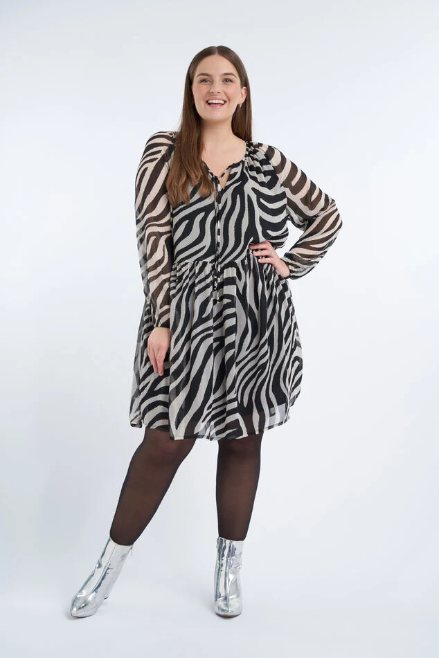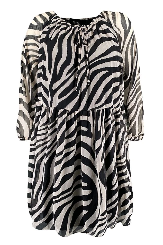 Cette robe tunique a une taille élastique et met merveilleusement en valeur les formes féminines. La tunique est imprimée sur l’ensemble et a une coupe trapèze.